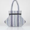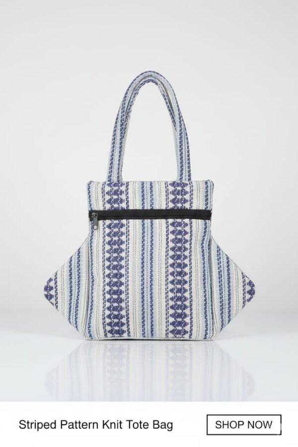 our stylish Striped Pattern Knit Tote Bag designed with a beautiful blue and white woven pattern. The bag has a structured shape with slightly flared sides, giving it a modern and unique silhouette.